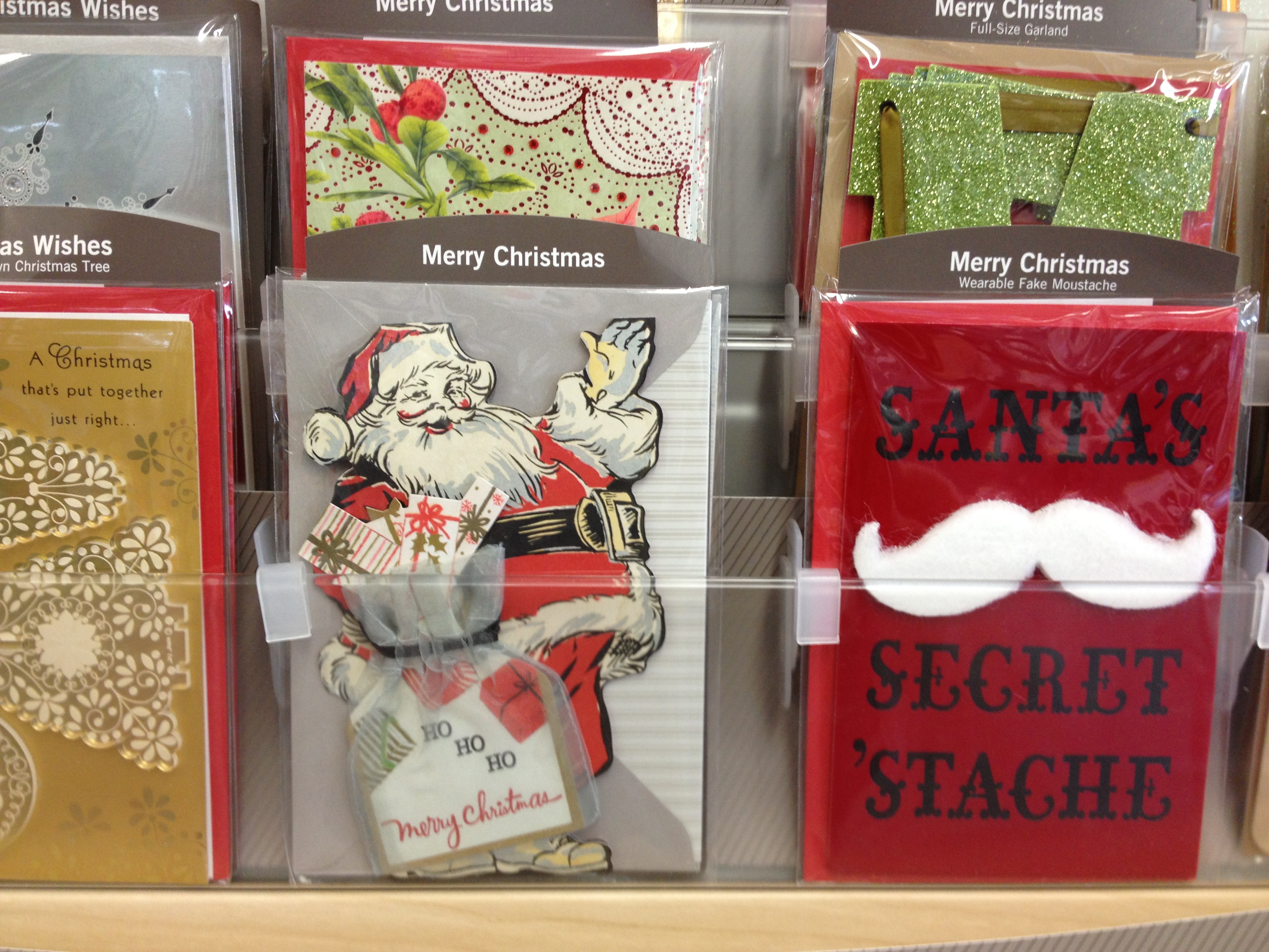 Today, I was picking up a few things at my local Walgreens and decided to check out their card aisle. It is a little meager, compared to a whole Hallmark store, the likes of which I’m not sure we have in Chicago. However, I managed to find a few cards that made me chuckle; caroling with Yoda (it’s hard because he speaks strangely), a banana age joke, and, my favorite, Santa’s stache (see below). Walgreens has a whole line of Christmas cards that include fun things like ornaments, build your own mini tree, a banner and, of course, a Santa’s mustache. (I may have also purchased a December countdown to Christmas activity calendar. Squeal! It is probably full of ideas for Holiday related fun).