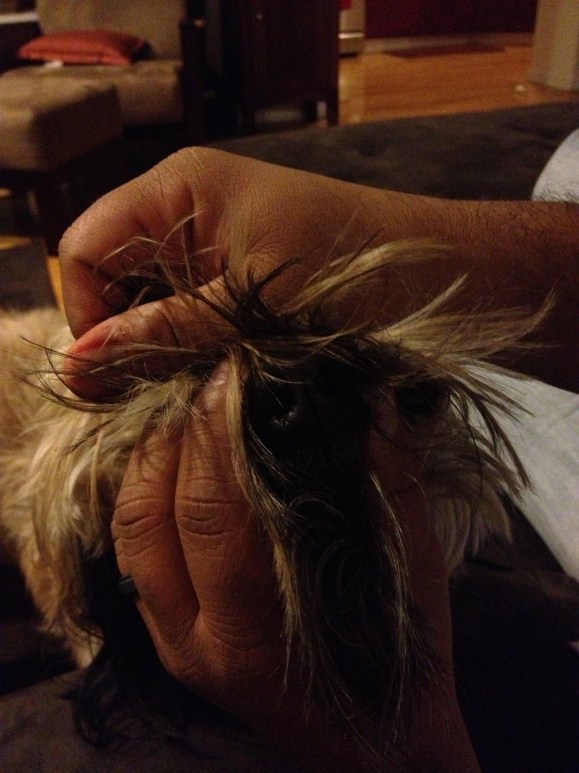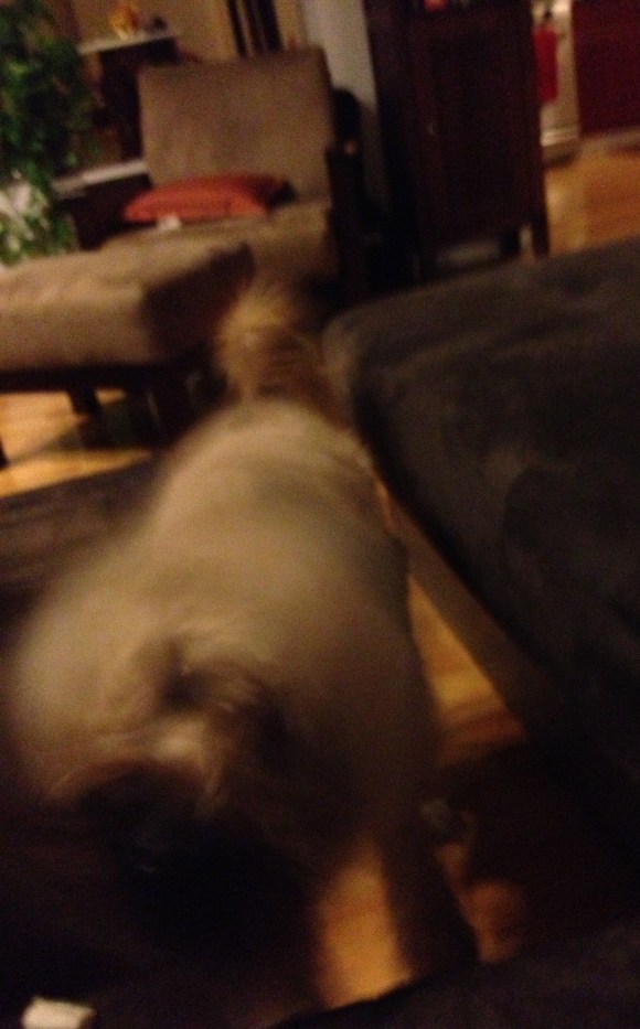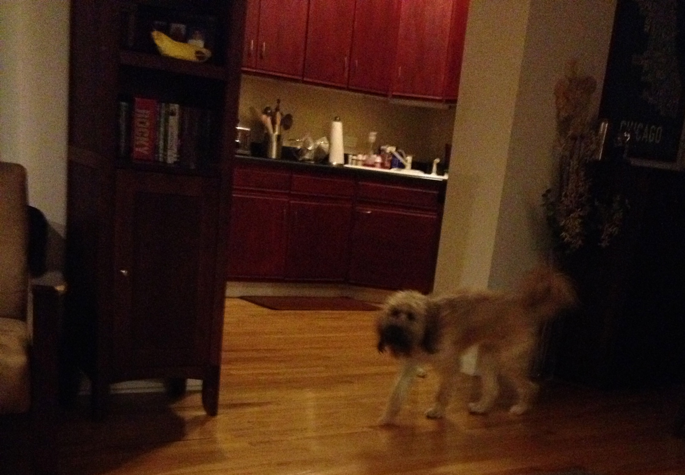We played two of our favorite games. Well, I don’t know if she actually likes the first one. I don’t totally either because it just involves my husband messing up the fur around her face and then us laughing at her crazy appearance. (Sometimes I think it is mean, but sometimes I laugh anyway–see pictures below). Her absolute, by far, favorite game, though is fetch. She will fetch anything anytime anywhere. Tonight we played with one of her small rawhide bones. I throw, she chases and brings it back. Sometimes she throws it for herself (or really launches it out of her mouth somehow) which is actually the best.