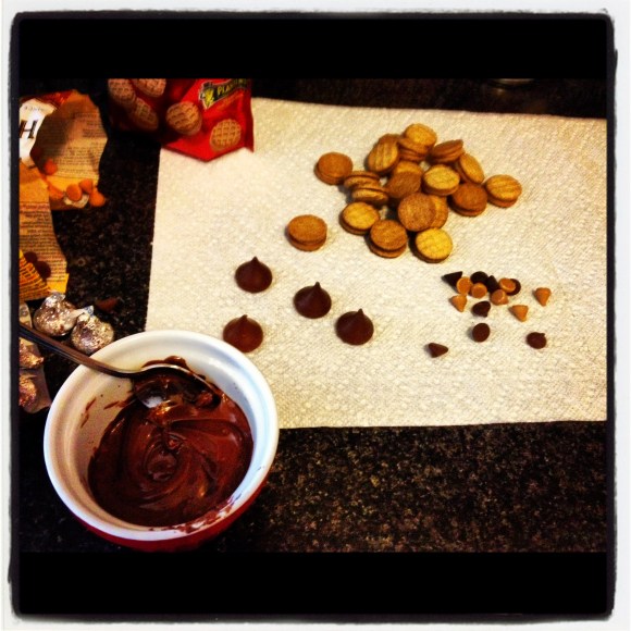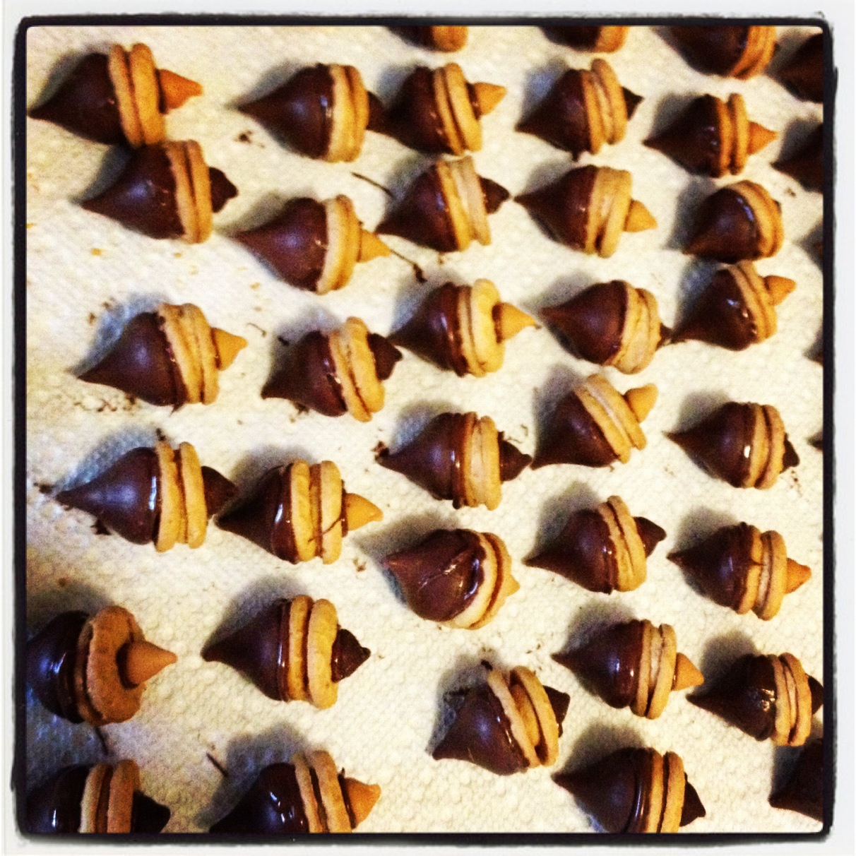 Melt some chocolate (I melted about 3/4 cup of chocolate chips). Dip the flat end of a Hersey’s Kiss in to the chocolate. Dip a chip (I used chocolate and butterscotch, but you could also use peanut butter, white chocolate, dark chocolate, etc.) into the excess chocolate on the kiss. Stick the kiss to one side of the cookie and center the chip on the other. Voila! Delicious acorn.