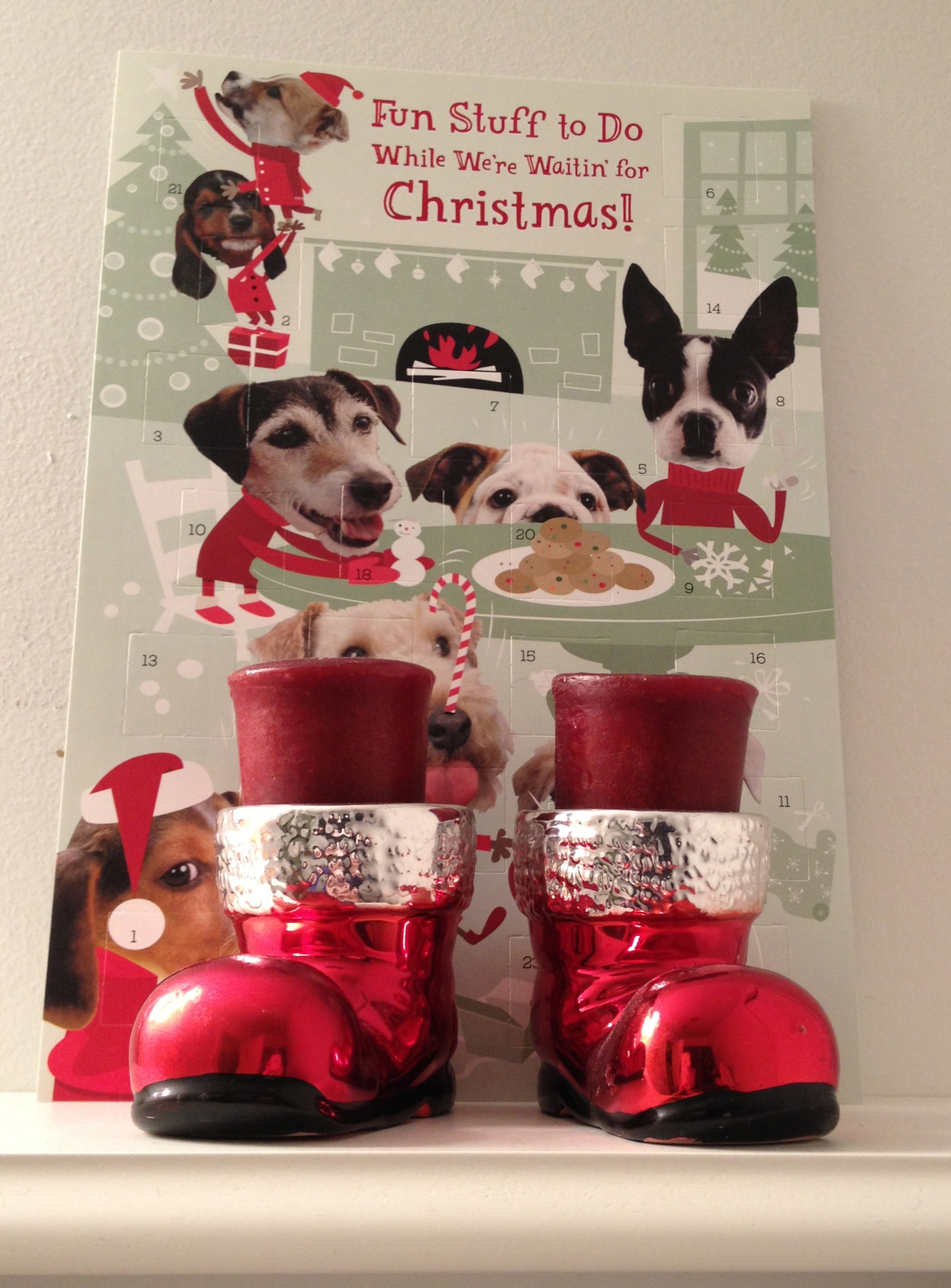 Bathroom Shelf. Santa’s boots candle holders (I honestly do not remember where I got these. I’ve had them for so long) and December activity card from Walgreens.