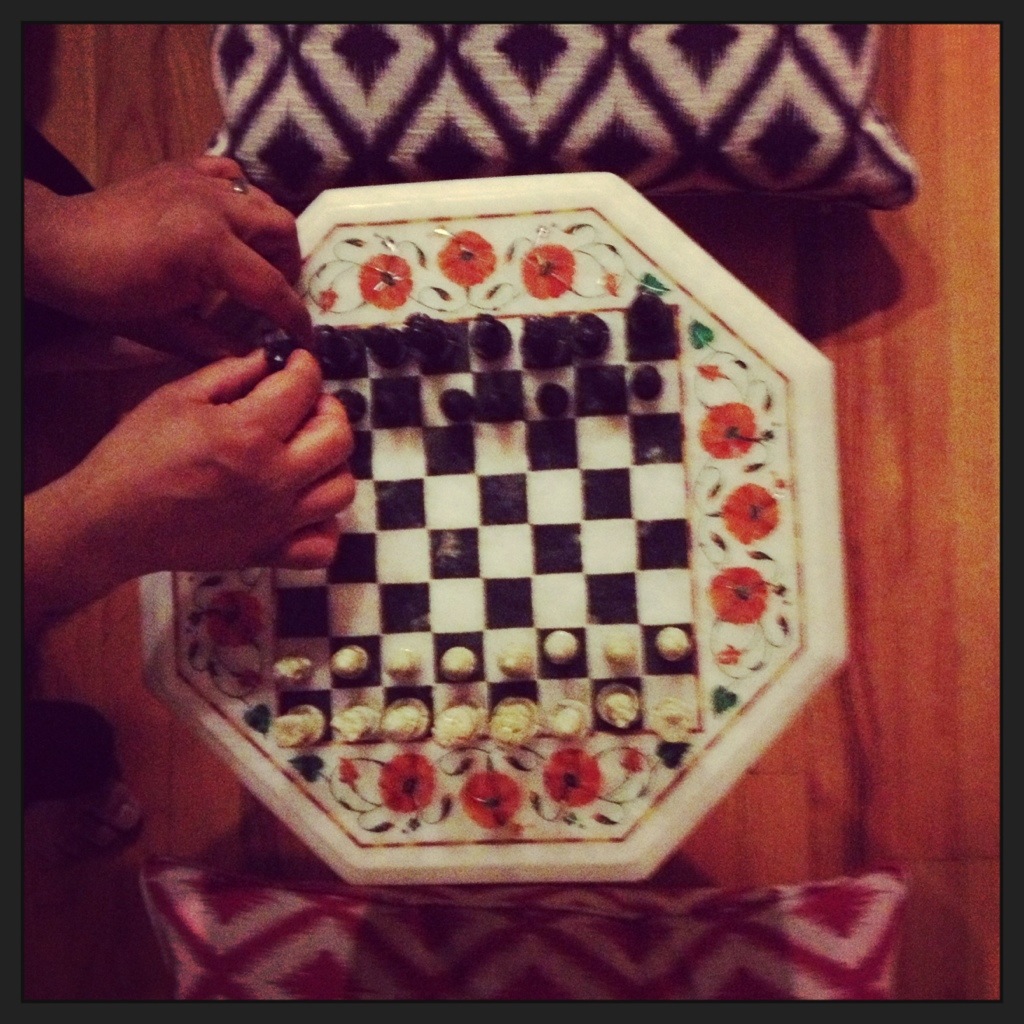 As I mentioned in a previous post, the hubs has been trying to challenge me to a game of chess. Here is my knowledge of chess: I know how the pieces move. I have maybe played twice. The hubs, however, has had this amazing chess set, that he brought back from a trip to India in his teens (it is made from the same marble as the Taj Mahal), on display ever since I’ve known him. Leading me to believe that he could be some kind of chess shark.