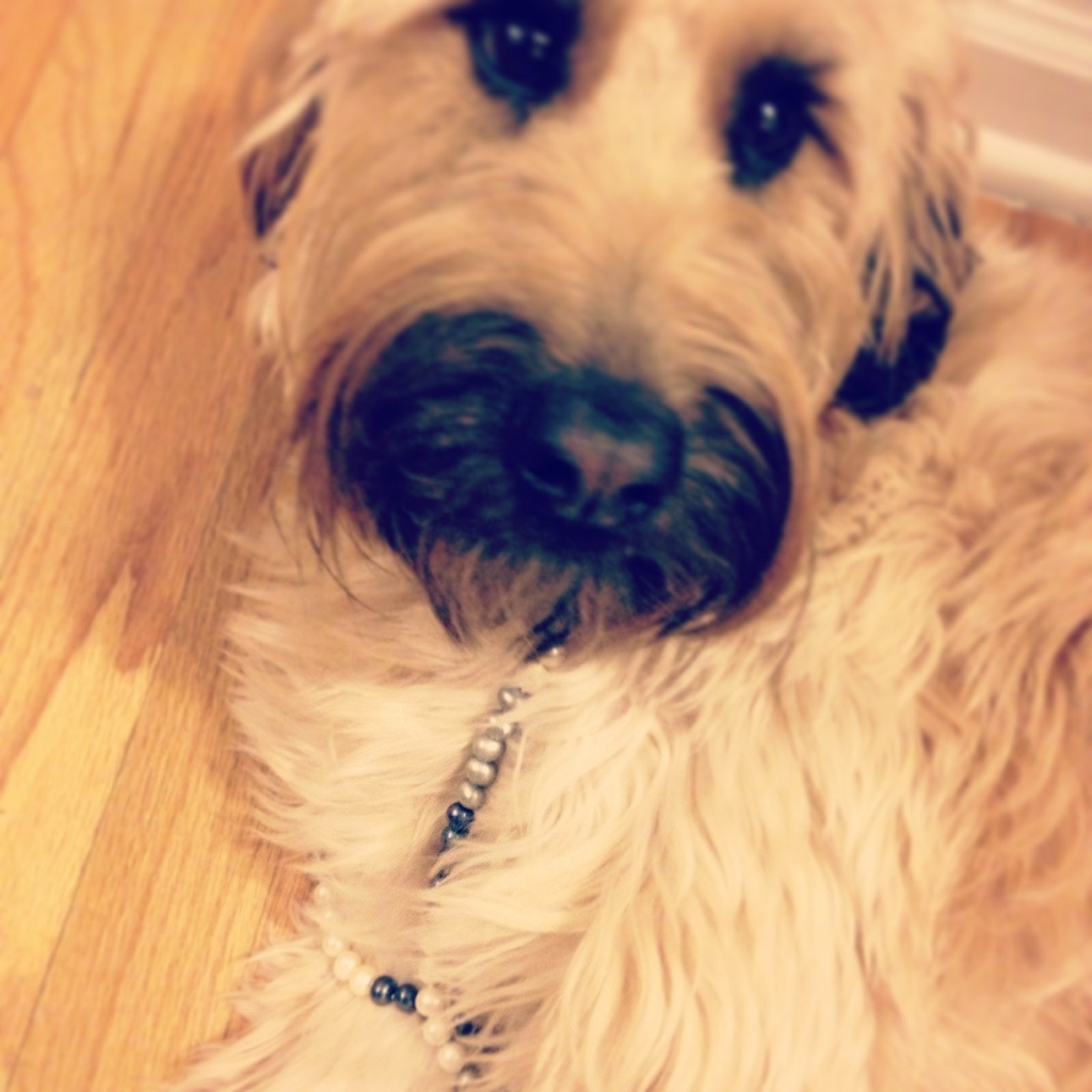 Today’s fun happened by accident. The hubs and I are in the habit of what I call Mr. Rogers-ing, meaning we always change out of work clothes right when we get home. I don’t know why, but when I took off my necklace, I thought it would be funny to put in on Elphie. This turned in to Elphie trying on a few different necklaces and one of my favorite bracelets. Then I started taking pictures and posting them to Instagram with the hope of starting the hashtag, #dogswearingjewelry. Silly, weird and the kind of fun people with pets have.
