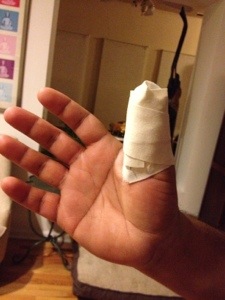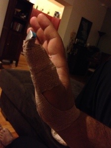 He cut his thumb this weekend and we had to go to urgent care. He is fine and did not need stitches but he did end up with steri-strips and in a splint. He was supposed to leave it alone until he could get in to see his doctor. But his bandage started getting uncomfortable and slipping.